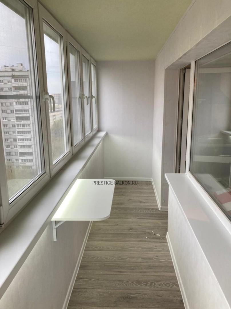 Проведено двухслойное утепление пола, потолка и всех стен контактирующих с улицей. Настелен и выровнен по уровню черновой пол из фанеры, установлен теплый инфакрасный пол с автоматическим терморегулятором, поверх настелен ламированный паркет. Проведена электрофикация лоджии с установкой розеток, выключателя и освещения. Обшиты стены и потолки пластиковыми ламинированными панелями. Дополнительно установлен откидной столик и установлена светодиодная подсветка под подоконник. Все работы на объекте заняли 3 дня, изготовление окон 10 дней