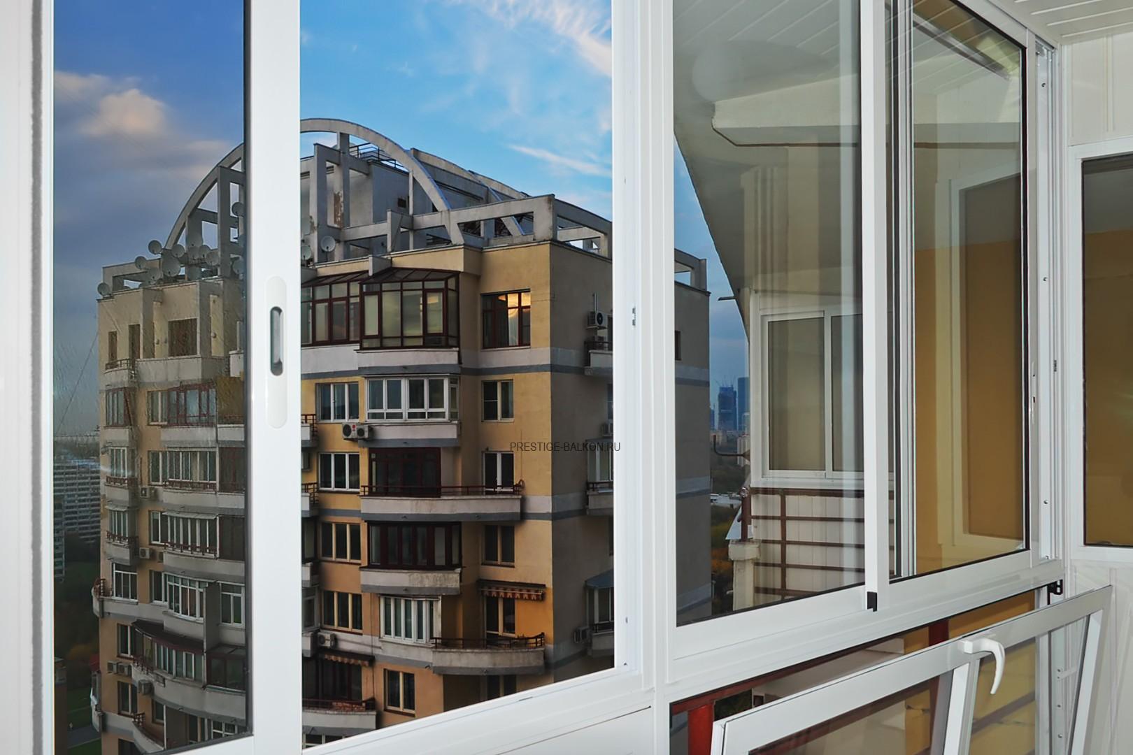 Алюминиевое раздвижное остекление балкона профилем Provedal и отделкой потолка вагонкой ПВХ